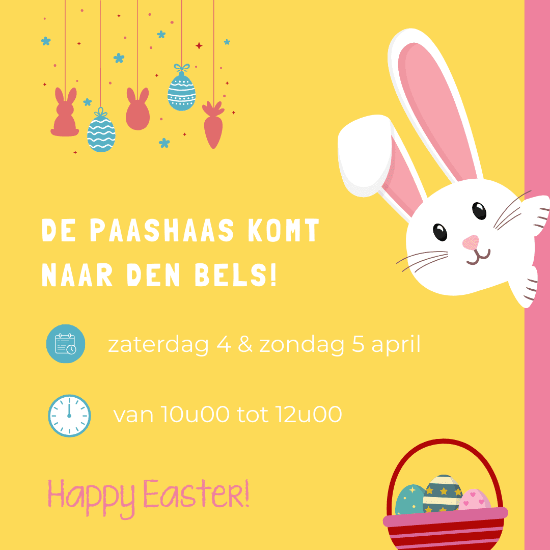 Op zaterdag 4 en zondag 5 april komt de paashaas langs Den Bels. Van 10u tot 12u mag je je verwachten aan een zoete traktatie! Zien we jullie daar?