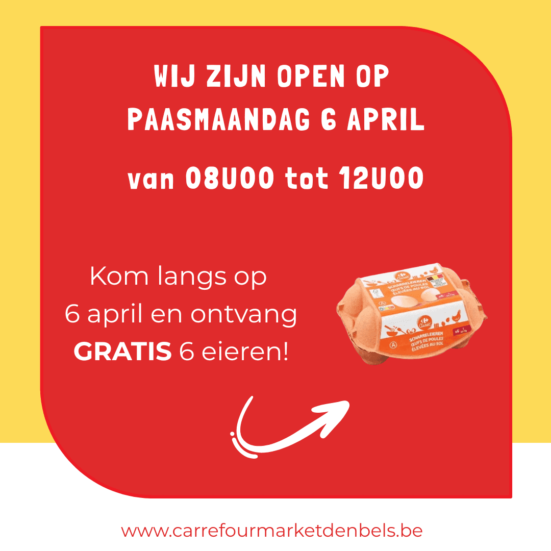 Voor het eerst is Den Bels dit jaar ook open op Paasmaandag! We openen de deuren om 8u en sluiten om 12u. En we voorzien voor iedereen die langskomt een attentie, 6 gratis eitjes van Carrefour.